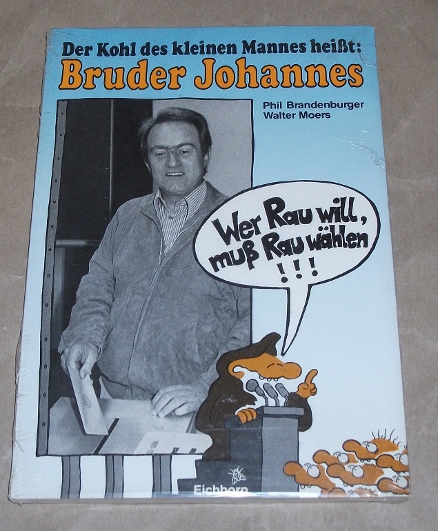 Moers, Walter; Brandenburger, Phil: Der Kohl des kleinen Mannes heisst – Bruder Johannes. Wer Rau will, muss Rau wählen. Frankfurt am Main: Eichborn, 1986. 22 cm. [67] S., Ill. Kart. Ungelesen. Originalverschweißt.
