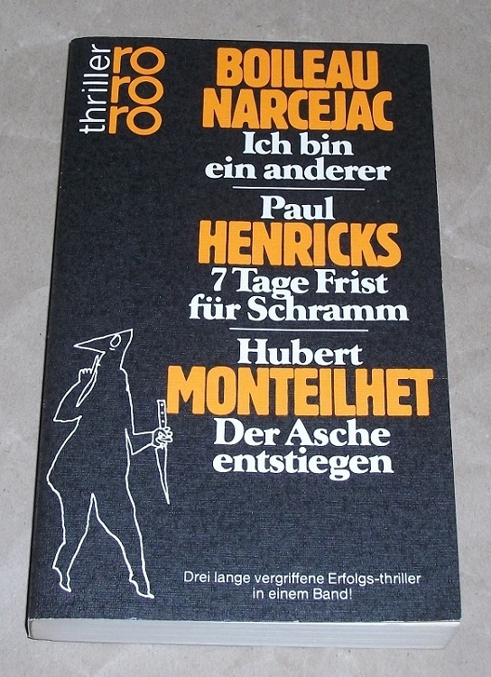 Boileau, Pierre; Narcejac, Thomas / Henricks, Paul / Monteilhet, Hubert: Ich bin ein anderer / 7 Tage Frist für Schramm / Der Asche entstiegenDrei lange vergriffene Erfolgs-Thriller in einem Band.. Reinbek bei Hamburg: Rowohlt, 1981. 19 cm. 365 S. TB. Schnitt gebräunt. Leichte Gebrauchsspuren. rororo ; 2557 : rororo-Thriller : Sammelbd. Einheitssacht. d. 2. beigef. Werkes: Le retour des cendres <dt.>