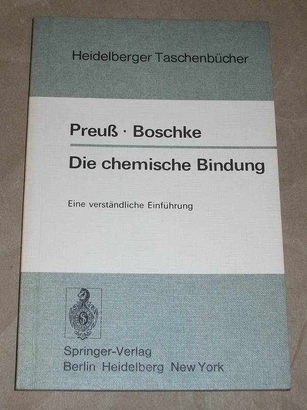 Preuß, Heinzwerner; Boschke, Friedrich Ludwig: Die chemische Bindung. Eine verständliche Einführung. Berlin, Heidelberg, New York: Springer, 1975. 21 cm. VIII, 82 S. TB. Leichte Gebrauchsspuren. Schnitt gebräunt. Riecht etw. muffig. Heidelberger Taschenbücher ; Bd. 161. Auf d. Umschlag: Preuss-Boschke.