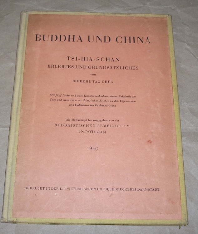 Steinke, Martin: Buddha und China. Tsi-Hia-Schan ; Erlebtes und Grundsätzliches. Als Manuskript. hrsg. / v. d. Buddhistischen Gemeinde e. V. in Potsdam. Darmstadt: Wittich, 1940. 4. 30 S., Mit 5 Licht- u. 2 Kunstdruckbildern, einem Faksimile im Text und einer Liste der chinesischen Zeichen zu den Eigennamen und buddhistischen Fachausdrücken.. Ln. mit aufmontierten Teilen des Originalumschlages. Deutliche Gebrauchsspuren. Einband Ecken und Kapitale bestoßen, berieben, fleckig / angeschmutzt. Das Blatt mit den chinesischen Zeichen lose, z.T. Seiten braunfleckig. Auf der hinteren Einband-Innenseite war wohl mal was eingeklebt. Div. Eintragungen / Stempel im Vorsatz, Stempel a. T. Mit handschriftlicher Widmung des Autors auf dem Titelblatt, datiert Januar 1941. signiert.