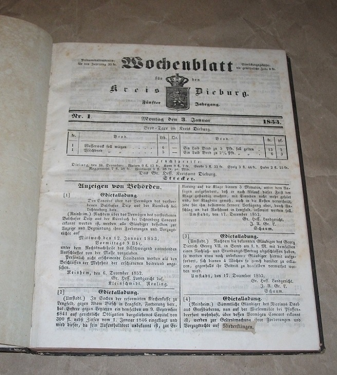 Wochenblatt für den Kreis Dieburg Nr. 1 – 52 / fünfter Jahrgang 1853. Dieburg: Rachor, 1853 25 cm, n.n. S. Pbd. der Zeit. Einband etw. berieben, Kapitale u. Ecken bestoßen. Block etw. wellig, Papier gebräunt / braunfleckig. Insgesamt altersgemäß gut erhalten. Früher ( Jahrgang 1- 4): Wochenblatt für den Regierungsbezirk Dieburg