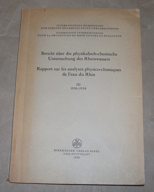 Bericht über die physikalisch-chemische Untersuchung des Rheinwassers = Rapport sur les analyses physico-chimiques de l’eau du Rhin. III 1956 – 1958. Koblenz: Internat. Komm. zum Schutze des Rheins gegen Verunreinigung, 24 cm. 37 S. + ausklappbare Tafeln / Tabellen. Kart. Einband am Rücken etw. beschädigt, Ecken bestoßen. Einband u. Schnitt gebräunt. Sonst gut erhalten.