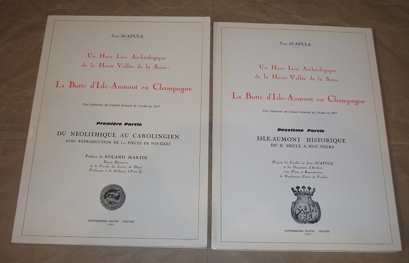 Scapula, Jean: Un haut lieu archéologique de la Haut Vallée de la Seine: La Butte d’Isle-Aumont en Champagne. Tome I + II. Premiere Partie: Du Neolithique Au Carolingien / Deuxieme Partie: Isle-Aumont Historique. 2 Bände. Troyes: Paton, 1981. 30 cm, 367 S. mit Abb. Kart. Umschläge etw. berieben / verkratzt.Etw. gebräunt. Band 1 Umschlagecke mit Knickspur. Gut erhalten. Jean Scapula