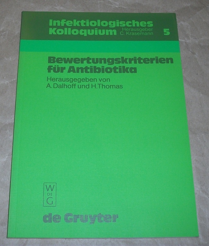 Dalhoff, Axel [Hrsg.]; Bergan, Tom [Mitverf.]: Bewertungskriterien für Antibiotika. Berlin/New York: de Gruyter, 1988. 24 cm. VIII, 89 S., graph. Darst. Kart. Leichte Gebrauchsspuren. Mit Werbeeindruck / Aufkleber für Bayer im Vorsatz. Infektiologisches Kolloquium ; 5. Literaturangaben