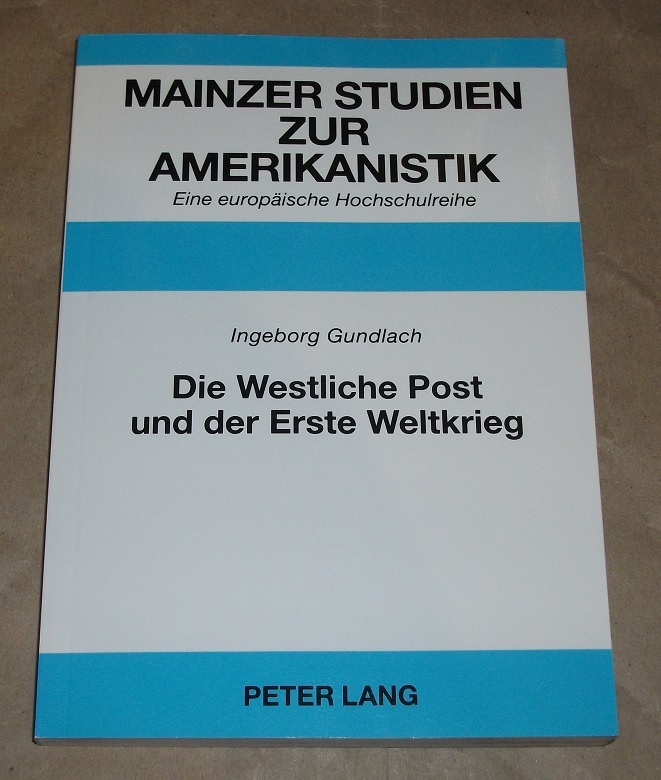 Gundlach, Ingeborg: Die Westliche Post und der Erste Weltkrieg. Eine deutschsprachige Zeitung in den USA zwischen „Vaterland“ und „Adoptivvaterland“. Frankfurt am Main/Berlin/Bern/Bruxelles/New York/Oxford/Wien: Lang, 2005. 21 cm. IX, 250 S. Kart. Unterer Schnitt etw. angeschmutzt, sonstgut erhalten. Mainzer Studien zur Amerikanistik ; Bd. 48. Mit handschriftlicher Widmung der Autorin im Vorsatz, signiert u. datiert Darmstadt, Januar 2005.