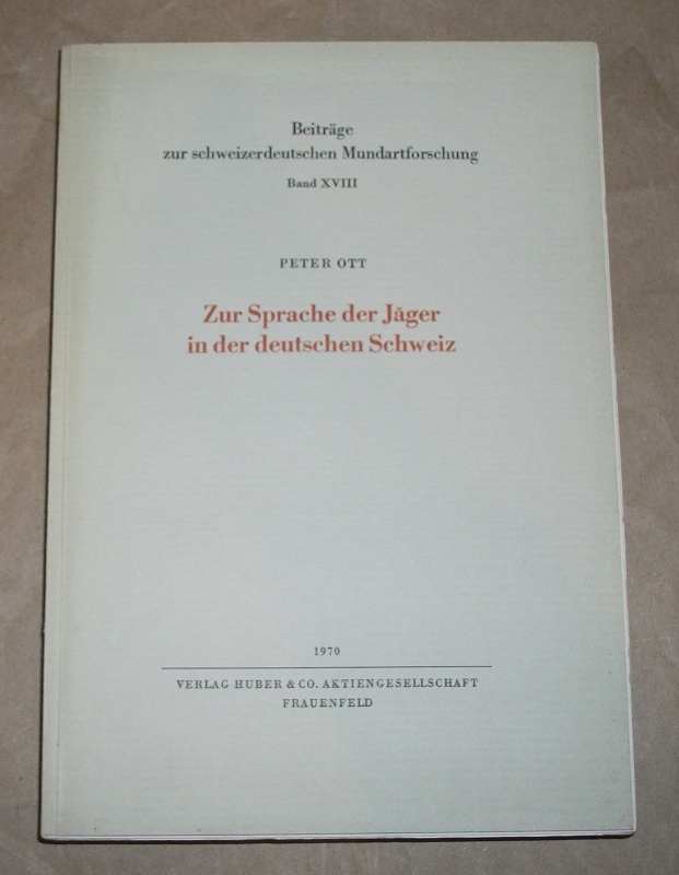 Ott, Peter: Zur Sprache der Jäger in der deutschen Schweiz. Frauenfeld: Huber & Co., 1970. gr. 8. IV, 411 S. Kart. Einband u. Schnitt gebräunt. Unaufgeschnitten. Leichte Gebrauchsspuren. Beiträge zur schweizerdeutschen Mundartforschung ; Bd. XVIII [18.] Mit Literaturverz. (S. 215 – 217)
