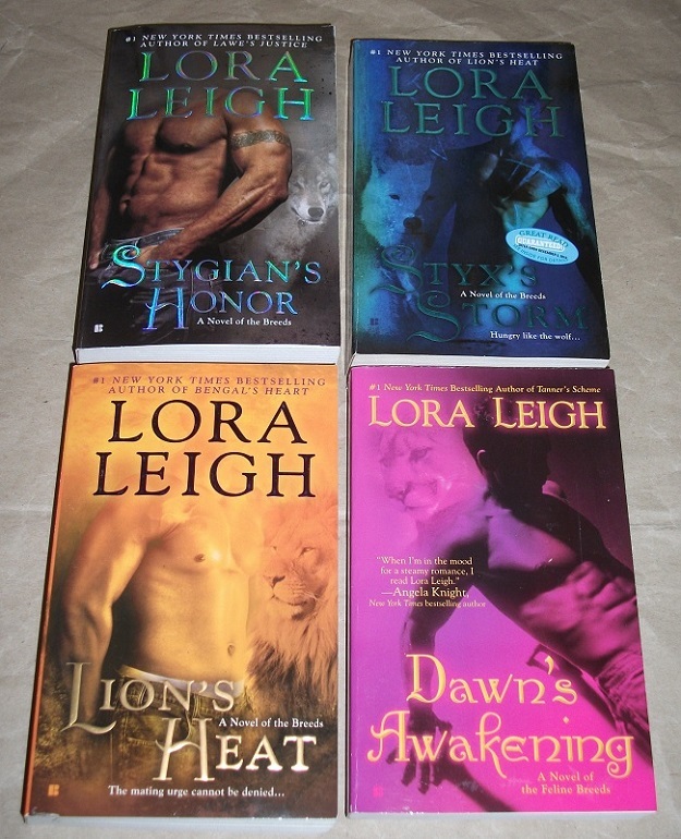 Leigh, Lora: Stygian´s Honor / Styx´s Storm / Lion´s Heat / Dawn´s Awakening. A Novel of the Breeds / Feline Breeds. Konvolut von 4 Bänden. 4 Bände. New York: Berkley 2008 – 2012 17 cm, 374 / 293 / 356 / 294 S. TB.s. Rücken mit leichten Knickspuren vom lesen, leichte Gebrauchsspuren.
