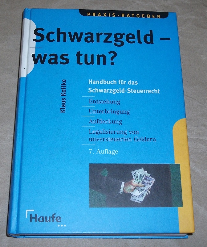 Kottke, Klaus: Schwarzgeld – was tun? Handbuch für das Schwarzgeld-Steuerrecht ; Entstehung, Unterbringung, Aufdeckung, Legalisierung von unversteuerten Geldern. 7., vollst. überarb. Aufl. Freiburg i. Br./Berlin/München, Haufe, 1997. 22 cm. 591 S. Pp. Etwas schief gelesen, Stempel im Vorsatz. Sonst leichte Gebrauchsspuren. Praxis-Ratgeber.