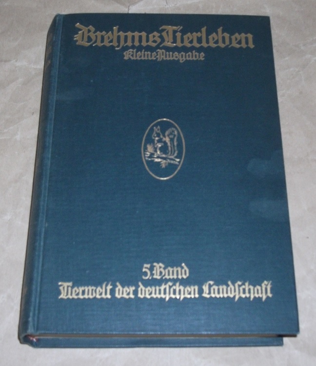 Rammner, Walter: Die Tierwelt der deutschen Landschaft. Das Leben der Tiere in ihrer Umwelt. Brehms Tierleben. Kleine Ausgabe Band 5. 3. verm. u. verb. Aufl. Leipzig: Bibliographisches Institut 1938. 26 cm, 475 S. mit 269 einfarbige u. 127 mehrfarbigen Abb. Ln. Einband etw. fleckig, am Rücken etw. verblichen. Kapitale bestoßen, Schnitt gebräunt u. etw. fleckig. Wenige Seiten am unteren Rand etw. braunfleckig. Gut erhalten.