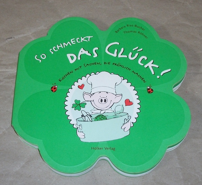 Rias-Bucher, Barbara; Röhner, Thomas: So schmeckt das Glück! Kochen mit Sachen, die fröhlich machen. Münster: Hölker, 2004. 19 cm. 64 S., zahlr. Ill. Pp. in Kleeblattform. Kanten etw. bestoßen, Einband etw. gebogen. Gut erhalten.