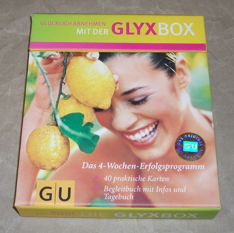 Grillparzer, Marion: Die GlyxBox. das 4-Wochen-Erfolgsprogramm ; 40 praktische Karten. 1. Aufl. München, Gräfe und Unzer, 2005. 19 cm + Begleitbuch (15 S. : Ill.) und Tagebuch (32 S.). 40 Bl., zahlr. Ill. in Box. Leichte Gebrauchsspuren.