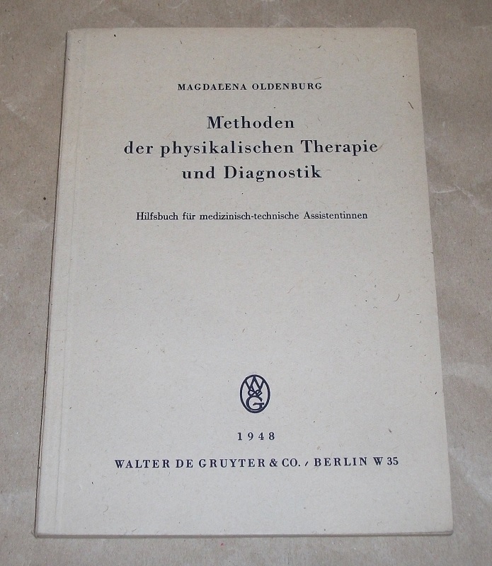 Oldenburg, Magdalena: Methoden der physikalischen Therapie und Diagnostik. Hilfsbuch für medizin.-techn. Assistentinnen. Berlin: de Gruyter, 1948. 8. 112 S., Mit 118 Abb. Kart. Leichte Gebrauchsspuren. Papier gebräunt.