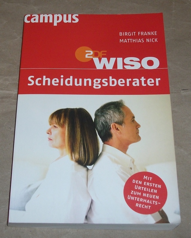 Franke, Birgit; Nick, Matthias: ZDF-WISO-Scheidungsberater. [mit den ersten Urteilen zum neuen Unterhaltsrecht]. 2., aktualisierte und überarb. Aufl. Frankfurt, M./New York, NY, Campus-Verl., 2010. 23 cm. 218 S. Kart. Kante / Ecken etw. bestoßen. Leichte Gebrauchsspuren.