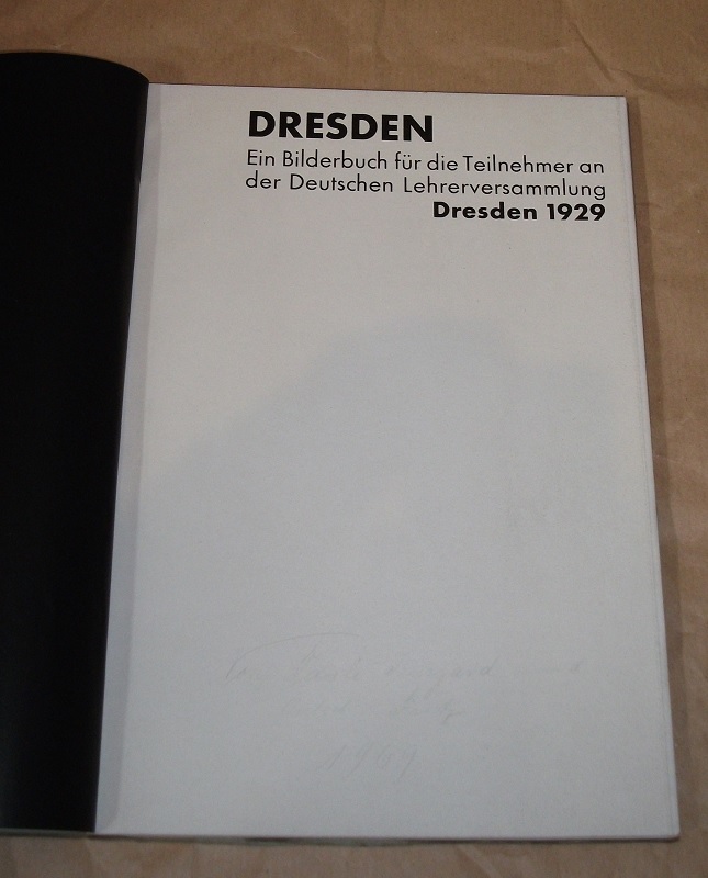 Dresden. Ein Bilderbuch für die Teilnehmer an der deutschen Lehrerversammlung Dresden 1929. s. l., [s. n.] (Dresden : C. C. Meinhold & Söhne), 1929. 4. 6 Falt-S., 120 S. Abb. Kart. Einband mit deutlichen Gebrauchsspuren ( Kanten bestoßen, untere Ecke vorne fehlt ein Stückchen, am Rücken entlang mit Einriß. Schnitt gebräunt, Widmung a. V. unter einem Bild handschriftlicher Vermerk. Sonst innen gut erhalten und sauber.