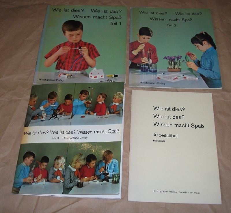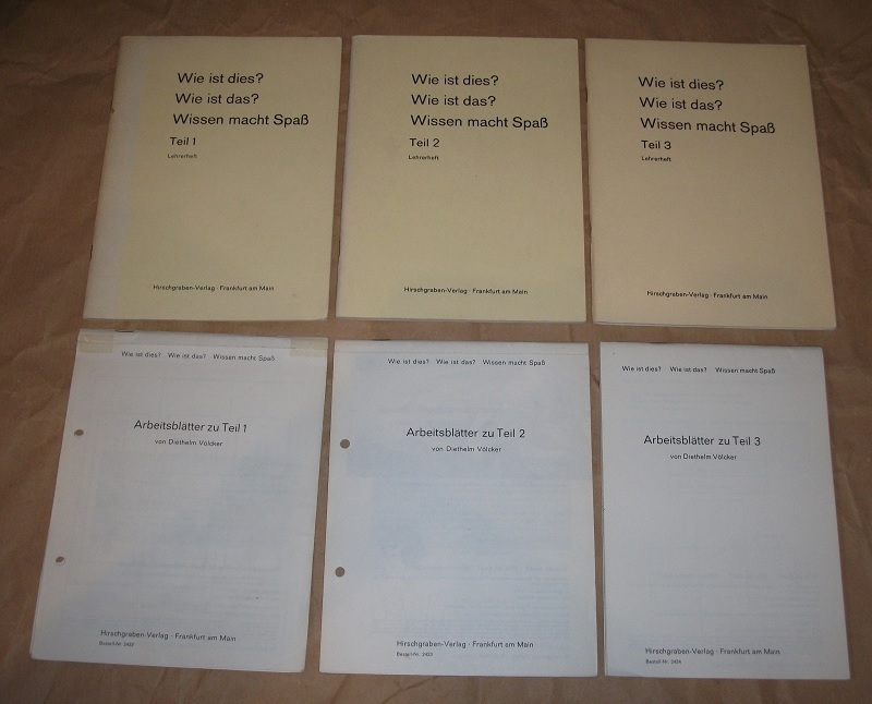 Völcker, Diethelm: Wie ist dies? Wie ist das? Teil 1-3 (jeweils mit Lehrerheft + Arbeitsblättern) + Arbeitsfibel Begleitheft. Wissen macht Spaß; ein Unterrichtswerk zur naturwissenschaftlichen, technischen Elementarbildung im Sachunterricht der Grundschulen. 5. / 3. Aufl. 10 Bände. Frankfurt/M.: Hirschgraben-Verl., 1971. 22 cm, mit Abb. Geheftet / Abreißblöcke. Ecken etw. bestoßen / z.T. mit Knickspuren. Einbände z.T. gebräunt / ausgeblichen. Bei den Arbeitsblättern zu Teil 1 Deckblatt + letztes Blatt mit Tesafilm angeklebt, 8vor allem) letztes Blatt mit Knickspuren. Teil 3 Name a. hinterer Einband-Innenseite. Insgesamt gut erhalten. von Diethelm Völcker. Arbeitsbl. zu T. 1.2