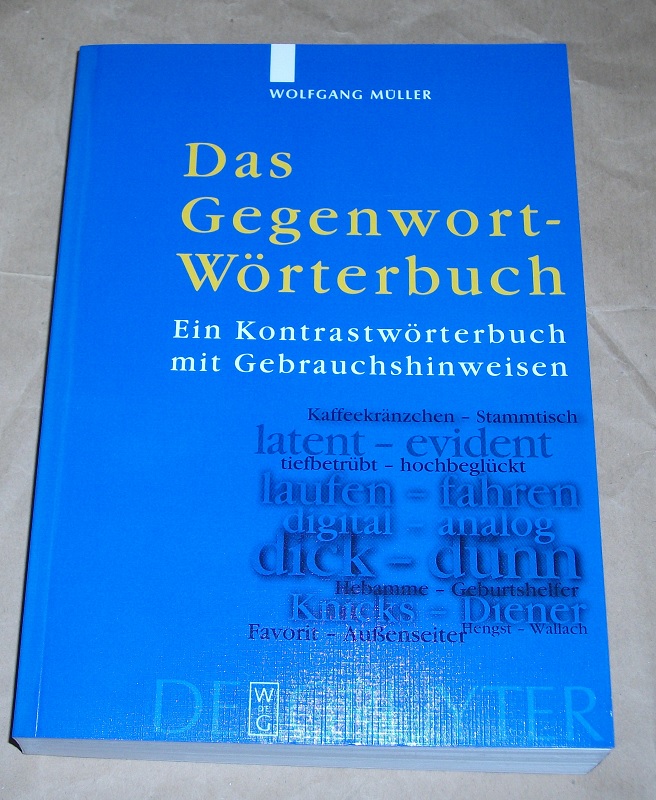 Müller, Wolfgang: Das Gegenwort-Wörterbuch. ein Kontrastwörterbuch mit Gebrauchshinweisen. Unveränd. Nachdr. der Ausg. von 1998. Berlin [u.a.]: Walter de Gruyter & Co., 2000. 24 cm. XXXVIII, 580 Seiten. Kart. Leichte Gebrauchsspuren.