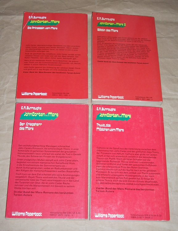 Burroughs, E. R.: John Carter vom Mars Band 1 – 4. Die Prinzessin vom Mars / Göttin [Götter] vom Mars / Der Kriegsherr vom Mars / Thuuia, das Mädchen vom Mars. 4 Bände. Alsdorf: Williams 1972 / 1973 19 cm, 184 / 195 / 192 / 172 S. mit Ill. Kart. Umschläge z.T. etw. geknickt / verkratzt / berieben. Schnitt gebräunt u. etw. fleckig. Besitzer-Stempel im Vorsatz. Insgesamt gut erhalten. Alles, was auf Deutsch in dieser Ausgabe erschienen ist.