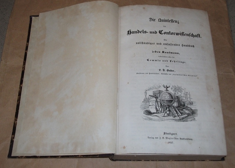 Huber, L. F.: Die Quintessenz der Handels- und Contorwissenschaft ; Ein vollständiges und umfassendes Handbuch für jeden Kaufmann, insbes. aber für Commis und Lehrlinge. Stuttgart: Metzler, 1857. 23,5 cm, IV, 716 S. Altdeutsche Schrift. HLn. der Zeit. Einband berieben, Ecken u. Kapitale 8etw.) bestoßen, am Rücken ausgeblichen. Braunfleckig, Schnitt gebräunt.