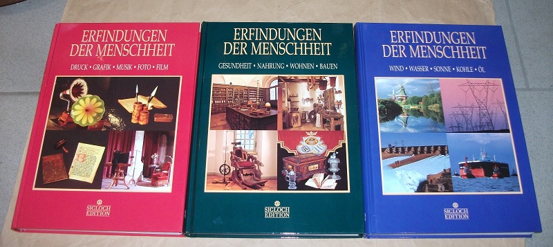 Gööck, Roland: Erfindungen der Menschheit. Komplett in 3 Bänden! Gesundheit, Nahrung, Wohnen, Bauen / Wind, Wasser, Sonne, Kohle, Öl. / Druck, Grafik, Musik, Foto, Film. 3 Bände. Blaufelden: Sigloch Edition o.J. 33 cm, mit Abb. Ppde. Leichte Gebrauchsspuren.
