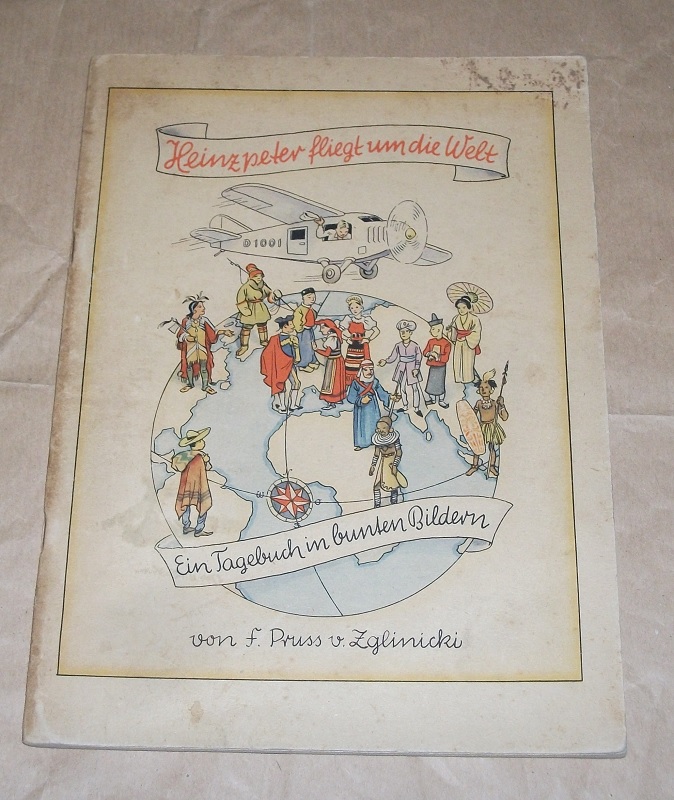 Zglinicki, Friedrich Pruss von: Heinzpeter fliegt um die Welt. Ein Tagebuch in bunten Bildern. Berlin: Erich Klinghammer 1943 25 cm, [15] Bl überw. Ill. Geheftet. Einband u. Schnitt stark fleckig / angeschmutzt, Ecken bestoßen. Papier gebräunt u. z.T. braunfleckig.
