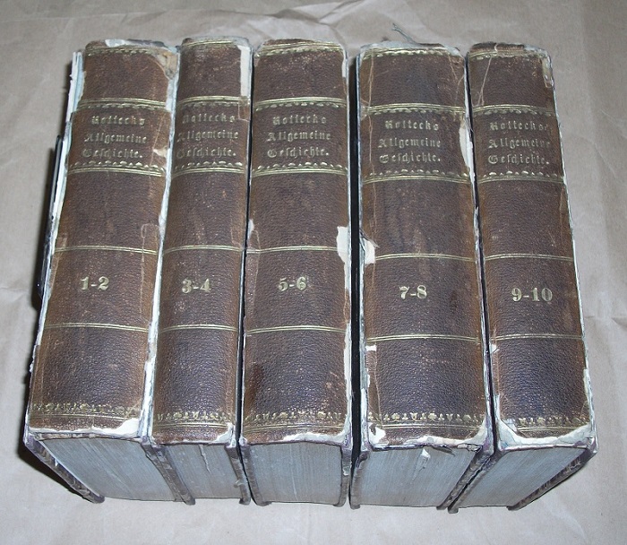 Rotteck, Karl von: Allgemeine Geschichte. Band 1-10 in 5 Bänden. Vom Anfang der historischen Kenntniß bis auf unsere Zeiten. Für denkende Geschichtsfreunde bearbeitet. 8., vermehrte u. neu durchgesehene Original-Ausgabe 5 Bände. Freiburg i. Br.: Herder 1832 21 cm, HLdr. Einbände mit starken Gebrauchsspuren. Rücken an den Kanten aufgeplatzt, dadurch Einbanddeckel z.T. gelockert. Kapitale u. Ecken bestoßen / beschädigt. Schnitte gebräunt. Aus Raucherhaushalt.