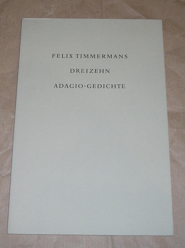 Timmermans, Felix: Dreizehn Adagio – Gedichte. Zum Felix-Timmermans-Jahr 1997 für die Mitglieder der Felix-Timmermans-Gesellschaft e.V., Kleve gedruckt in einer Auflage von 400 Exemplaren. Sonderdruck. Frankfurt/M.: Insel 24,5 cm, n.n.S. Kart. Leichte Gebrauchsspuren. Einband mit leichten Randläsuren.