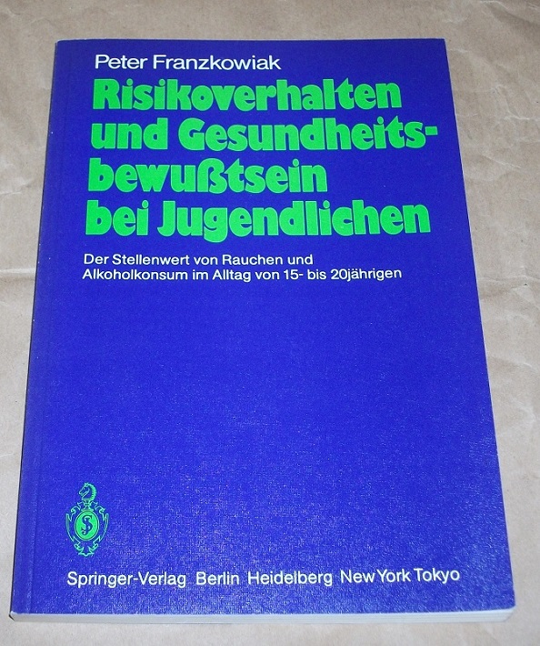 Franzkowiak, Peter: Risikoverhalten und Gesundheitsbewusstsein bei Jugendlichen. Der Stellenwert von Rauchen u. Alkoholkonsum im Alltag von 15- bis 20jährigen. Berlin/Heidelberg/New York, Springer, 1986. 25 cm. X, 222 S. Kart. Einband etw. geknickt, Schnitt gebräunt u. fleckig, Namensaufkleber im Vorsatz. Sonst gut erhalten.