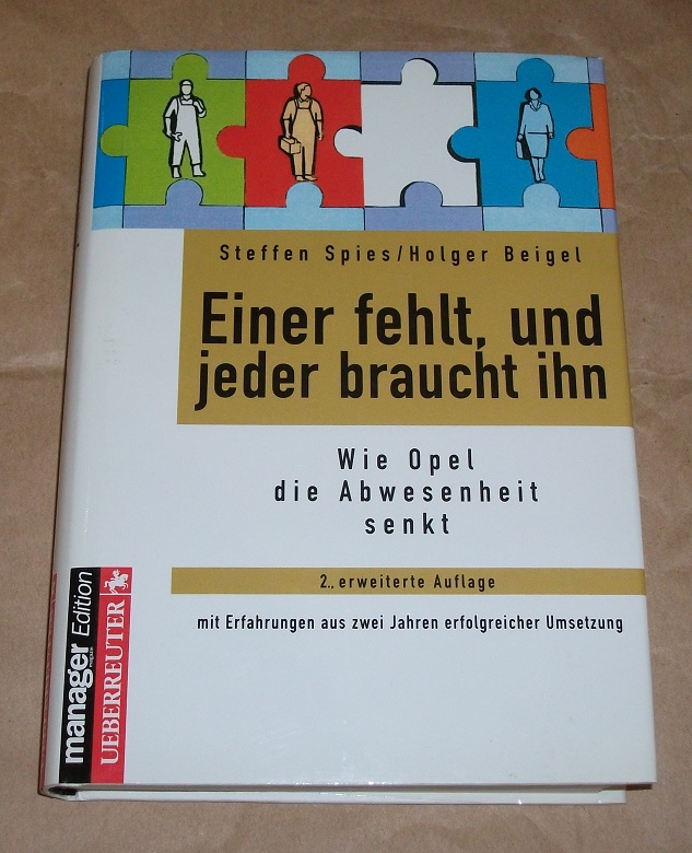 Spies, Steffen: Einer fehlt, und jeder braucht ihn. Wie Opel die Abwesenheit senkt ; mit Erfahrungen aus zwei Jahren erfolgreicher Umsetzung. 2., erw. Aufl. Wien: Ueberreuter, 1997. 21 cm. 230 S. graph. Darst. Ppd., SU. Schnitt etw. fleckig, z.T. mit Ansztreichungen. Gut erhalten. Manager-Magazin-Edition.