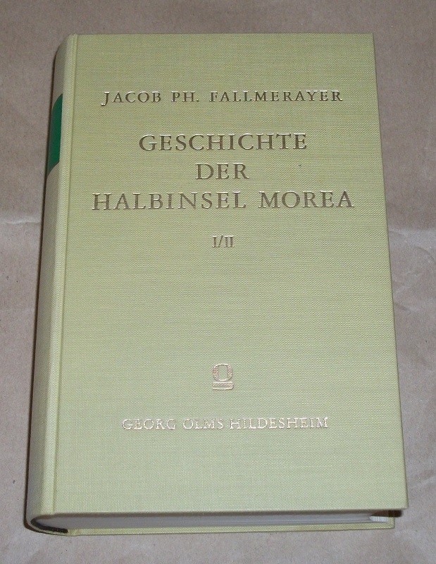Fallmerayer, Jakob Philipp: Geschichte der Halbinsel Morea während des Mittelalters I / II in einem Band. Nachdruck. Hildesheim: Georg Olms 1965 20 cm, XVI, 432 / XLIV, 455 S. Ln. Einband am Rücken etw. verblichen. Schnitt gebräunt. Gut erhalten.