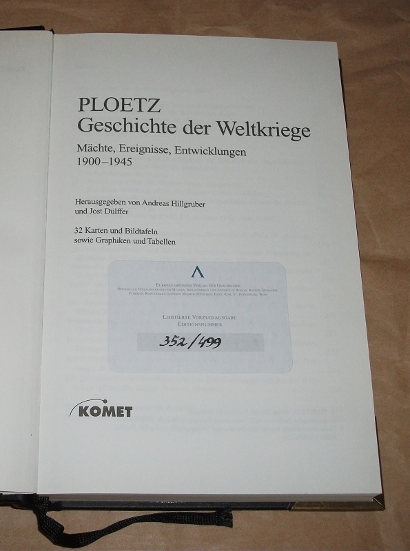 Ploetz: Geschichte der Weltkriege. Limitierte Vorzugsausgabe. Mächte, Ereignisse, Entwicklungen, 1900 – 1945. Frechen: Komet, 2002. 24 cm, 304 S. Ill., graph. Darst., Kt. Leder mit Metallecken. Leichte Gebrauchsspuren. Exemplar Nr. 352 von 499 der limitierten Vorzugsausgabe.