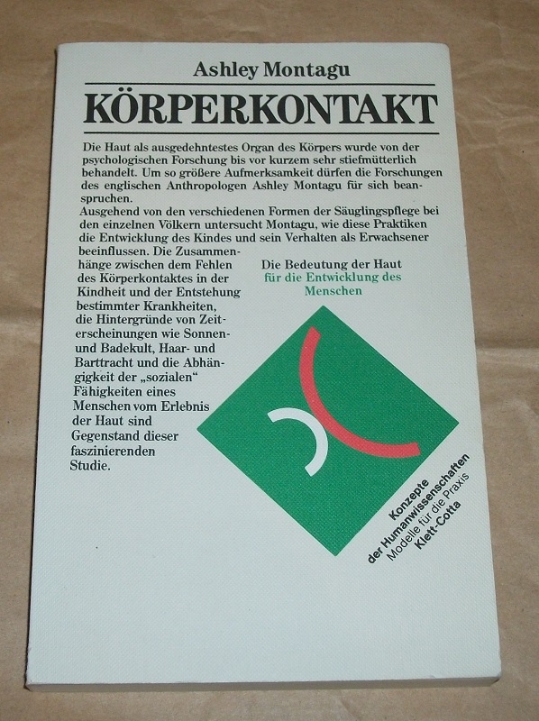 Montagu, Ashley: Körperkontakt. Die Bedeutung der Haut für die Entwicklung des Menschen. 8. Aufl. Stuttgart: Klett-Cotta, 1995. 22 cm. 265 S. graph. Darst. Kart. Leichte Gebrauchsspuren. Konzepte der Humanwissenschaften.