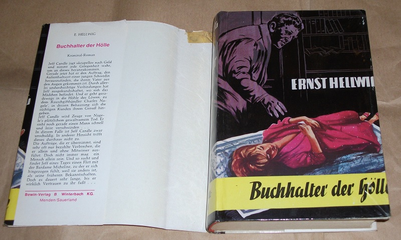 Hellwig, Ernst: Buchhalter der Hölle. Kriminal-Roman. Menden: Bewin / B. Winterbach o. J. 18 cm, 239 S. Folienkaschierter Ppd., SU. SU. mit Randläsuren u. angeschmutzt. Etwas schief gelesen, Kapital bestoßen, Schnitt gebräunt u. oben mit Fleck. Keine Eintragungen / Stempel. Verlags-Nr. 1534.