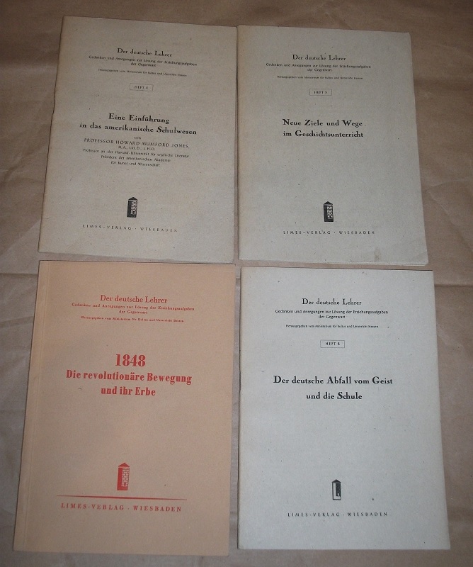 Der Deutsche Lehrer. Hefte 4 , 5, 6/7, 8. Gedanken und Anregungen zur Lösung der Erziehungsaufgaben der Gegenwart. Heft 4: H.M.Jones: Eine Einführung in das amerikanische Schulwesen / Heft 5: Neue Ziele und Wege im Geschichtsunterricht / Heft 6/7: 1848 Die revolutionäre Bewegung und ihr Erbe / Heft 8: Der deutsche Abfall vom Geist und die Schule. 4 Bände. Wiesbaden: Limes 1947 / 1948 20,5 cm, 31 / 55 / 79 / 40 S., Geheftet. Leichte Gebrauchsspuren. Der Deutsche Lehrer.