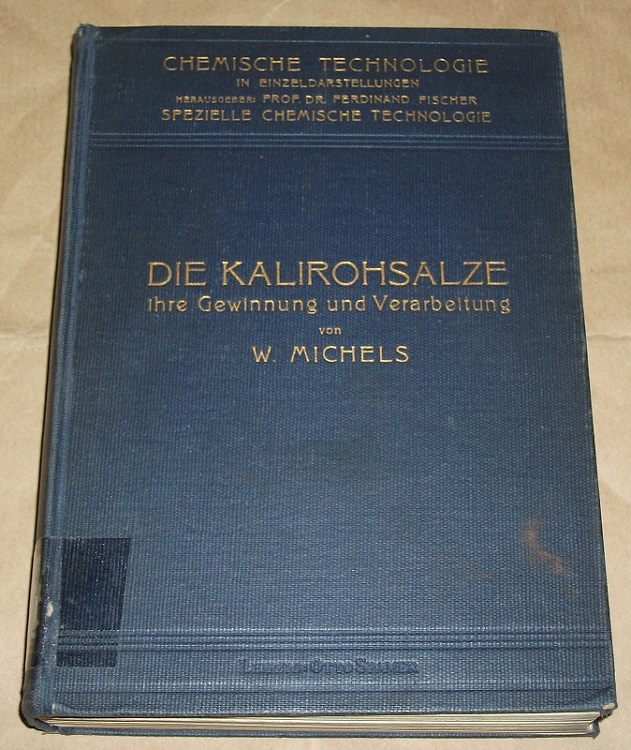 Michels, Wilhelm: Die Kalirohsalze, ihre Gewinnung und Verarbeitung. Leipzig: Spamer, 1916. 8. VIII, 339 S. Mit 149 Fig. u. 1 Übersichtskt. Ln. Ehem. Bibliotheks-Exemplar mit entsprechenden Kennzeichen. Deutliche Gebrauchsspuren. Kapitale u. Einbandecken bestoßen, Einband fleckig, Schnitt gebräunt u. angeschmutzt. z.T. Anstreichungen mit Bleistift. Chemische Technologie in Einzeldarstellungen : Spezielle chemische Technologie.