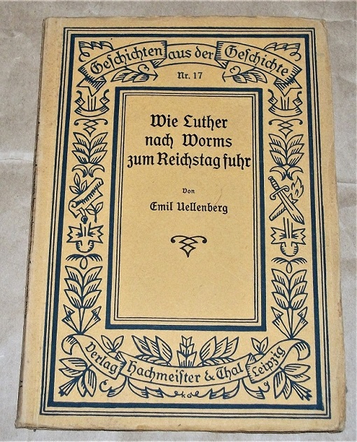 Uellenberg, Emil: Wie Luther nach Worms zum Reichstag fuhr. Eine historische Erzählung. Leipzig: Hachmeister & Thal, 1922. kl. 8. 62 S., altdeutsche Schrift. Kart. Einband u. Papier gebräunt, Einband-Kanten bestoßen. Gut erhalten. Geschichten aus der Geschichte, Nr 17.