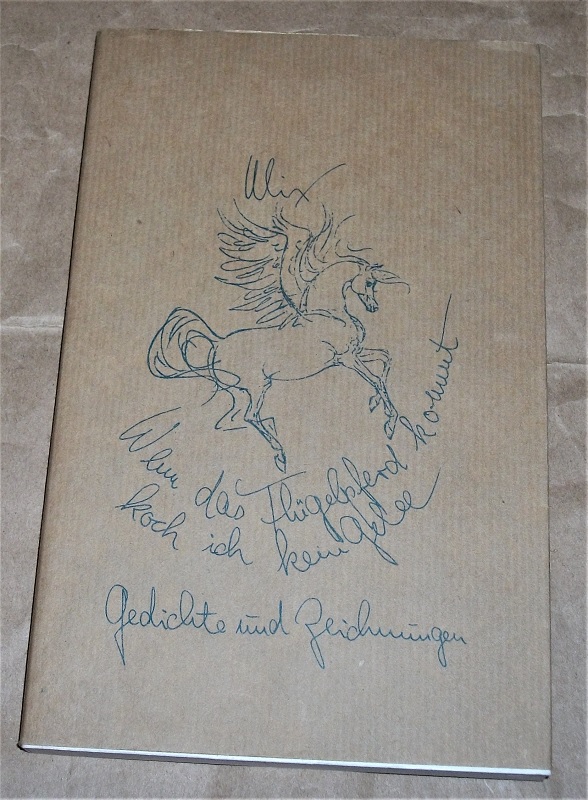 Lixfeld, Ursula [ Ulix ]: Wenn das Flügelpferd kommt koch ich kein Gelee. Gedichte und Zeichnungen. 1. Aufl. Bad König: Ursula Lixfeld 1993 21 cm, 93 S. mit Ill. Kart., SU. Leichte Gebrauchsspuren. Ex Nr. 374.