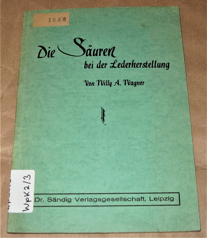 Wagner, Willy A.: Die Säuren bei der Lederherstellung. Leipzig: Sändig Verlagsges, 1940. 8. 32 S. Geheftet. Ehem. Bibliotheks-Exemplar mit entsprechenden Kennzeichen. Umschlag z.T. gebräunt / etw. fleckig. Einzelne Anstreichungen / Anmerkungen. Sammlung technischer Ratgeber.