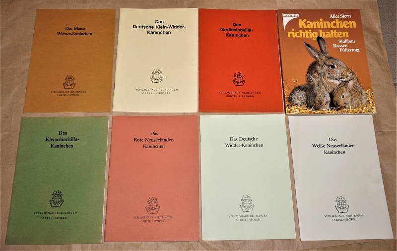 Kaninchen. Konvolut von 8 Bänden. Enthält: Das deutsche Klein-Widder-Kaninchen / Das deutsche Widder-Kaninchen / Das Blaue Wiener-Kaninchen / Das Großchinchilla-Kaninchen / Das Kleinchinchilla-Kaninchen / Das Rote Neuseeländer-Kaninchen / Das Weiße Neuseeländer-Kaninchen / nach Berichten von Spezialzüchtern. + Alice Stern: Kaninchen richtig halten. Stallbau Rassen Fütterung. verschiedene Aufl. 8 Bände. Reutlingen / Stuttgart:, Verlagshaus Reutlingen Oertel u. Spörer / Kosmos, um 1980 / 1991 21 cm. je 32 / 71 S. Ill. 7 x Geheftet, 1 x Kart. Umschlag z.T. etw. angeschmutzt / fingerfleckig. 1 x Vorsatz etw. braunfleckig. Gut erhalten. La-Ma-Fachbücher.