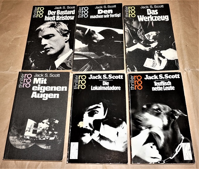 Scott, Jack S.: Konvolut von 6 Bänden. Enthält: Der Bastard hieß Bristow / Den machen wir fertig / Das Werkzeug / Mit eigenen Augen / Die Lokalmatadore / Teuflisch nette Leute. 6 Bände. Reinbek bei Hamburg: Rowohlt, 1981-1985 18 cm. TB. Kanten etw. berieben, Schnitte gebräunt. 2 x Umschlag mit Knickspuren. Sonst gut erhalten. rororo : rororo-Thriller Band 2570 / 2599 / 2628 / 2636 / 2678 / 2706