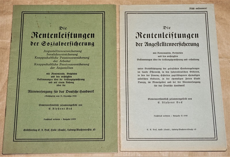 Beck, Eugen Alphons: Die Rentenleistungen der Angestelltenversicherung / Die Rentenleistungen der Sozialversicherung. Mit Rententafeln, Beispielen und den wichtigsten Bestimmungen über die Leistungsgewährung und -erhaltung unter Berücksichtigung d. gesetzl. Sonderregeunlungen im Lande Österreich, in den Sudetendeutschen Gebieten, … / Angestelltenversicherung Invalidenversicherung Knappschaftliche Pensionsversicherung der Arbeiter / der Angestellten…und mit einem Anhang über die Altersversorgung für das deutsche Handwerk. Ausg. II / Ausg.I. Halle (Saale) Ludwig-Wucherer-Str. 45, E. A. Beck, 1940 / 1939. 8. 15 S. auf 1 gefalt. Kartonbl. / 16 S. mit ausklappbarer Tafel. Kart. / Geheftet Leichte Gebrauchsspuren / Umschlag etw. fleckig, Klammern angerostet. Gut erhalten.