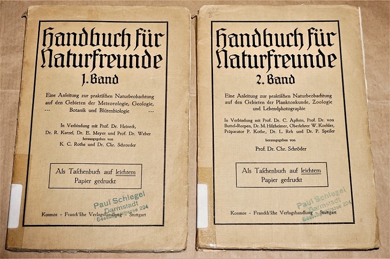 Rothe, K. C. u. Dr. Chr. Schroeder (Hrsg.): Handbuch für Naturfreunde Band 1 + 2. Bd. 1: Eine Anleitung zur praktischen Naturbeobachtung auf den Gebieten der Meterolgie, Geologie, Botanik und Blütenbiologie. Bd 2: Eine Anleitung zur praktischen Naturbeobachtung auf den Gebieten der Planktonkunde, Zoologie und Lebendphotographie. 2 Bände. Stuttgart, Franckh, 1911 / 1912. 20,5 cm, XVI, 285 / 275 S. Ill., graph. Darst. Kart. Deutliche Gebrauchsspuren. Ehem. Bibliotheks-Exemplar mit entsprechenden Kennzeichen. Kapitale beschädigt, Umschlag gebräunt / fleckig. Unbeschnitten. Innen sauber.
