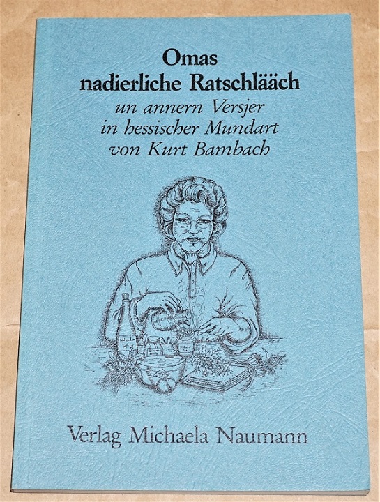Bambach, Kurt: Omas nadierliche Ratschlääch un annern Versjer in hessischer Mundart. 2. Aufl. Nidderau: Naumann, 1993. 21 cm. 63 S. Kart. Leichte Gebrauchsspuren.