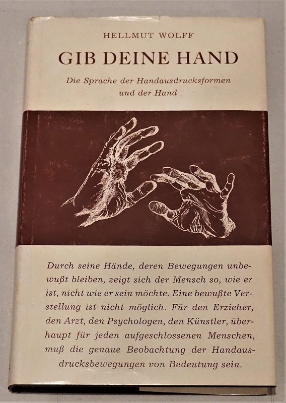 Wolff, Hellmut: Gib deine Hand. die Sprache der Handausdrucksformen und der Hand. Markt Rettenbach-Engetried, Eser, 1975. 21,5 cm, 126 S. : Ill. Ill. Ln., SU. SU. mit Randläsuren u. angeschmutzt / fleckig. Etwas schief gelesen, oberer Schnitt angeschmutzt, Schnitt gebräunt. Gut erhalten.