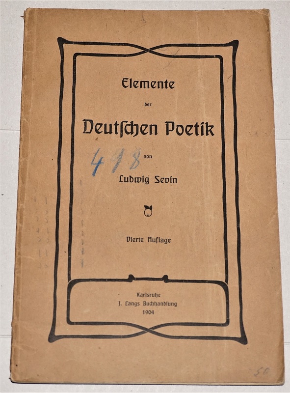 Sevin, Ludwig: Elemente der deutschen Poetik. 4. Aufl. Karlsruhe: Lang, 1904. 20,5 cm, 34 S. Kart. Umschlag mit deutlichen Gebrauchsspuren, Schnitt gebräunt, Ecken bestoßen, Name a. T.
