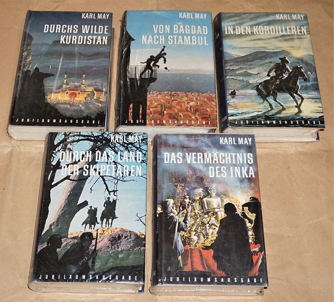 May, Karl: Jubiläumsausgabe. Konvolut von 5 Bänden. Durchs wide Kurdistan / Von Bagdad nach Stambul / in den Kordillieren / Durch das Land der Skipetaren / Das Vermächtnis des Inka. 5 Bände. Bamberg: Karl May Verlag 19 cm, Ln., SU. Ungelesen. Original eingeschweißt. Folie angestaubt, an den Ecken z.T. etw. berieben. Leichte Gebrauchsspuren.