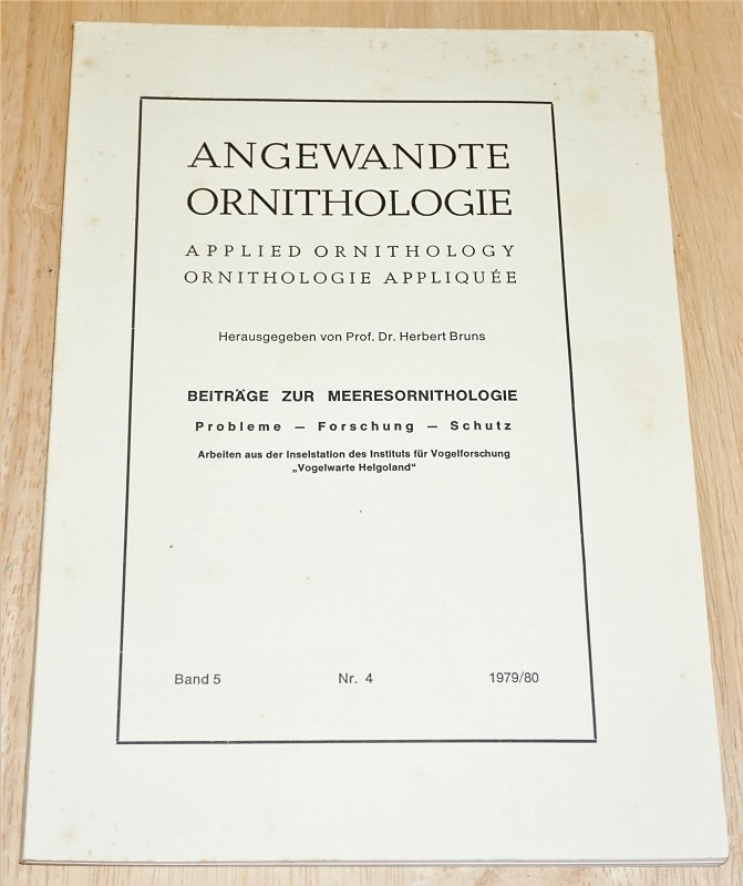 Beiträge zur Meeresornithologie. Probleme – Forschung -Schutz. Arbeiten aus der Inselstation des Instituts für Vogelforschung Vogelwarte Helgoland. Wiesbaden: Biologie-Verlag 1979/80 24 cm, S. 149 – 206, mit Abb. Kart. Umschlag branfleckig, sonst gut erhalten, innen sauber. Handschriftlicher Vermerk auf Titel. Angewandte Ornithologie Applied Ornithology Band 5 Nr. 4.