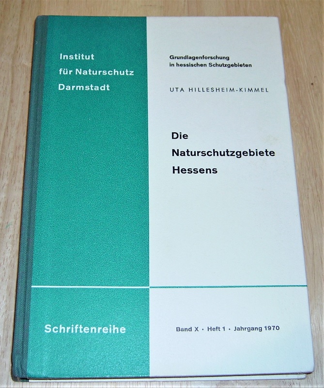 Hillesheim-Kimmel, Uta: Die Naturschutzgebiete Hessens. Eine erste Bestandsaufnahme. Darmstadt: Inst. für Naturschutz, 1970. 21 cm, XI, 211 S. Ill., Kt. HLn. Einbandecken / -Kanten bestoßen, oberer Schnitt etw. braunfleckig. Gut erhalten. Schriftenreihe / Institut für Naturschutz, Darmstadt 10,1. Uta Hillesheim-Kimmel