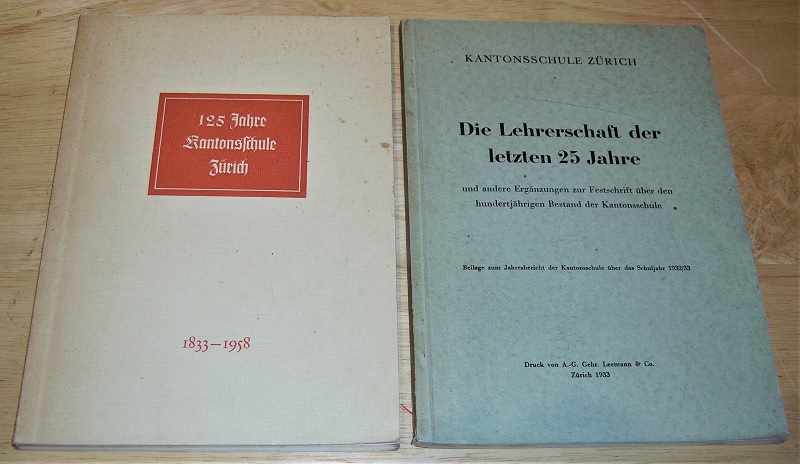 Kantonsschule Zürich: Die Lehrerschaft der letzten 25 Jahre/ 125 Jahre Kantonsschule Zürich. Und andere Ergänzungen zur Festschrift über den hendertjährigen Bestand der Kantonsschule. Beilage zum Jahresbericht der Kantonsschule über das Schuljahr 1932 / 33. / Geschichte, Behörden und Lehrer der letzten 25 Jahre 1933 – 1958. 2 Bände. Zürich: Gebr. Leemann & Co / Stäfa AG 1933 / 1958 20,5 cm, 72 / 150 S. mit Abb. Kart. Umschlag u. Schnitt gebräunt / braunfleckig. Ecken etw. bestoßen. Innen sauber und gut erhalten.