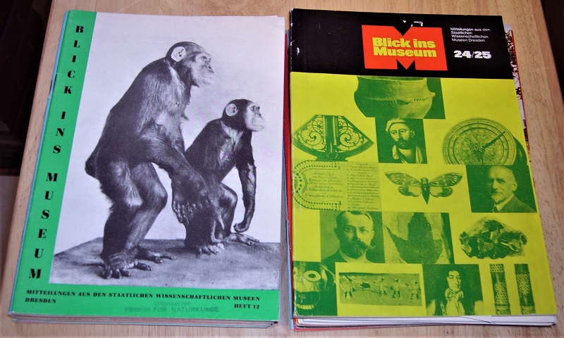 Blick ins Museeum. Konvolut von 18 Heften. Mitteilungen aus den staatlichen wissenschaftlichen Museen Dresden. Enthält: Juni 1968 , Heft 3/4 1969, Heft 5 1970 , Heft 6 1971, Heft 7 1971, Heft 8 1972, Heft 9 1972, Heft 10 /11 (Sonderausgabe zum 25. Jahrestag der DDR) 1973 , Heft 12 1974, Heft 13 1975, Heft 14 1975, Heft 15 1975 (Sonderheft zum 100. Jahrestag des staatlichen Museums für Völkerkunde Dresden), Heft 16 1976, Heft 17 1976, Heft 18, Heft 19, Heft 20/21 1978, Heft 24/25 1980. 18 Hefte. Dresden: Staatliche wissenschaftliche Museen 1968 – 1980 21 cm, je ca. 24-68 S. mit sw-Abb. Geheftet. Mit Gebrauchsspuren. Umschläge berieben / angeschmutzt, mit Stempel / Eingangsdatum. Schnitt gebräunt u. oben braunfleckig. Innen sauber. Aus der aufgelösten Bibliothek des Offenbacher Vereins für Naturkunde.