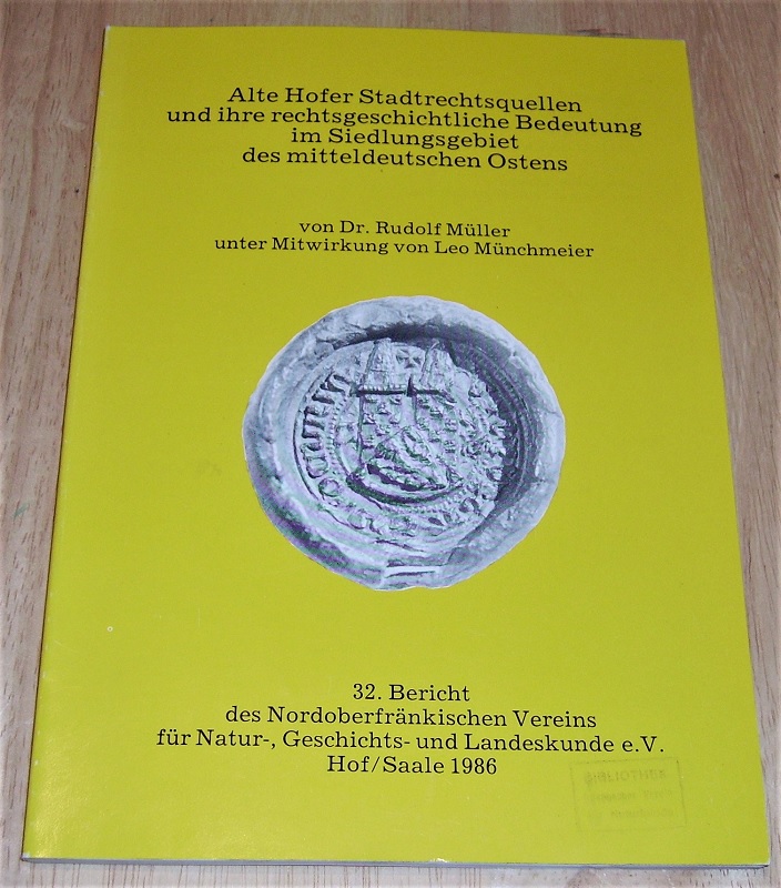 Müller, Rudolf: Alte Hofer Stadtrechtsquellen und ihre rechtsgeschichtliche Bedeutung im Siedlungsgebiet des mitteldeutschen Ostens. Hof/Saale: Nordoberfränk. Verein für Natur-, Geschichts- u. Landeskunde, 1986. 21 cm. 105 S. 1 Ill. Kart. Leichte Gebrauchsspuren. Kl. Stempel a. Umschlag u. Vorsatz. … Bericht des Nordoberfränkischen Vereins für Natur-, Geschichts- und Landeskunde e.V. Hof, Saale, 32. Aus der aufgelösten Bibliothek des Offenbacher Vereins für Naturkunde.